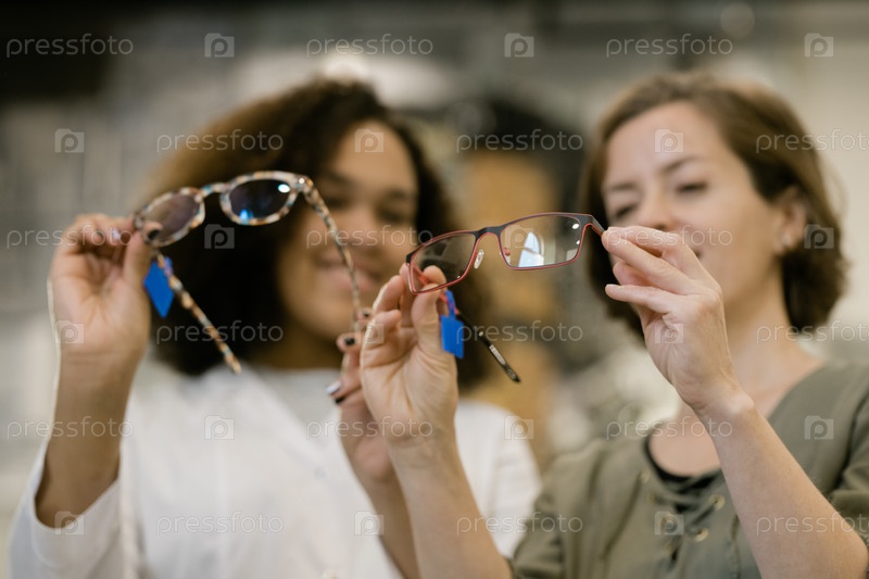Руки молодой консультантки и ее клиента, сравнивающих две модели очков