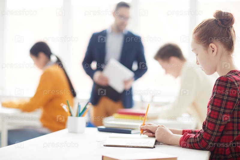 Серьезная сосредоточенная девушка с волосами, одетая в красное платье сидит за столом в классе и пишет в учебнике
