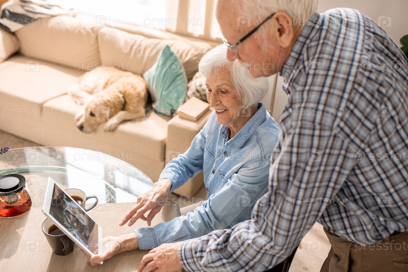 Веселая пожилая пара использует цифровой планшет