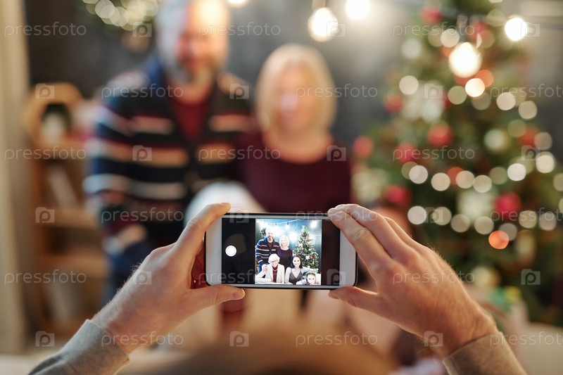 Руки мужчины, держащего смартфон во время фотографирования большой расслабленной семьи