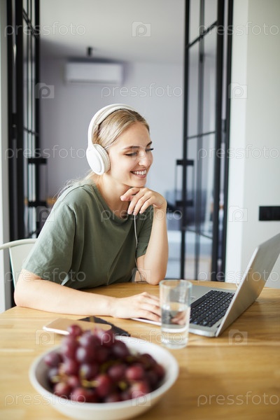 Милая веселая женщина смотрит на дисплей ноутбука во время работы в сети
