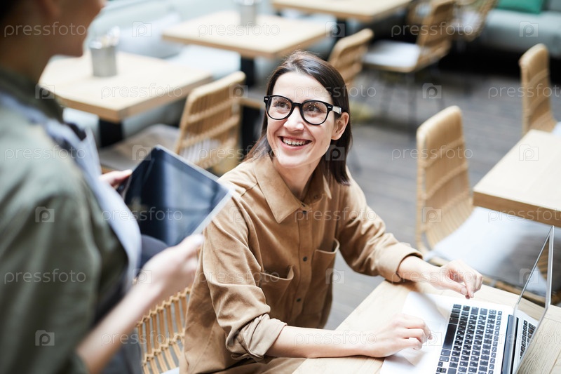Счастливая фрилансерская леди заказывает напиток в кафе