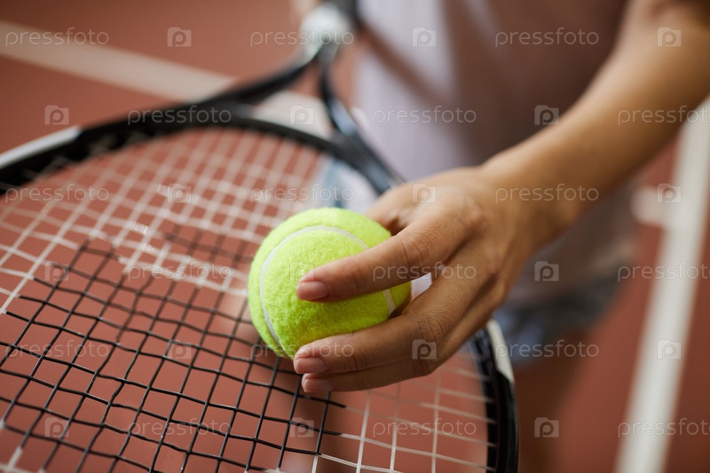 Близкий план неузнаваемой женщины, кладущей теннисный мяч на ракетку во время выполнения усилий по подаче перед матчем