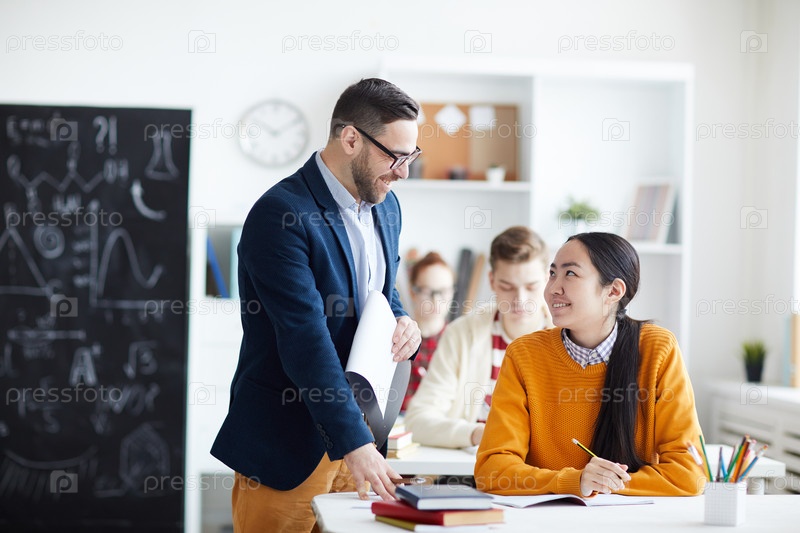 Позитивный красивый молодой учитель в очках, стоящий за столом и хваливший студента за хороший результат теста в классе