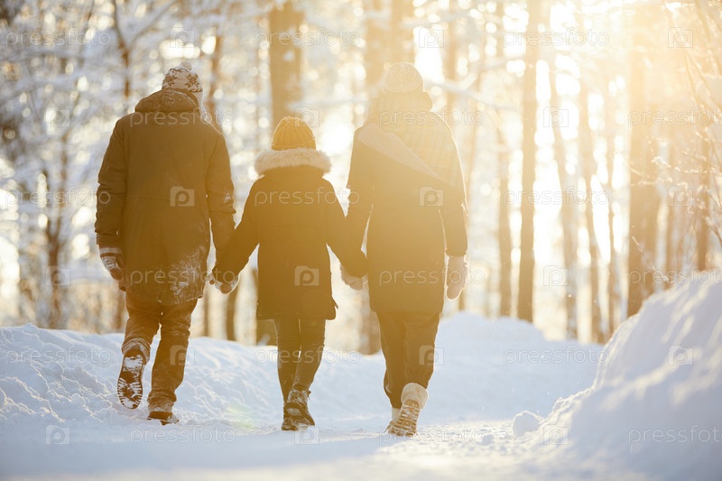 Семья наслаждается прогулкой по зимнему лесу