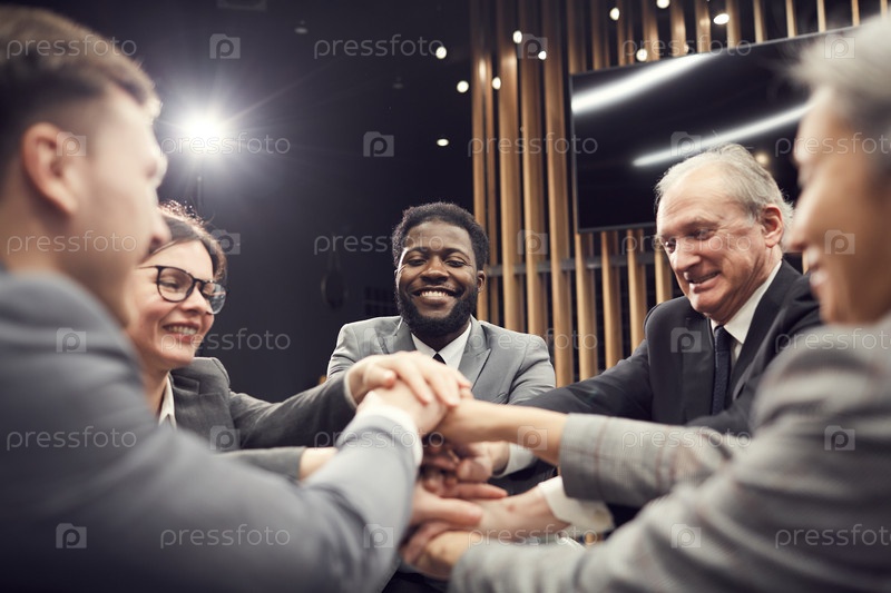 Группа веселых мультиэтнических деловых коллег, стоящих в кругу и складывающих руки друг другу, делая сильным командный дух