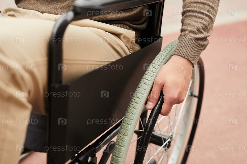 Близкий план неузнаваемого инвалида, сидящего в инвалидной коляске и поворачивающего поручни кресла на открытом воздухе