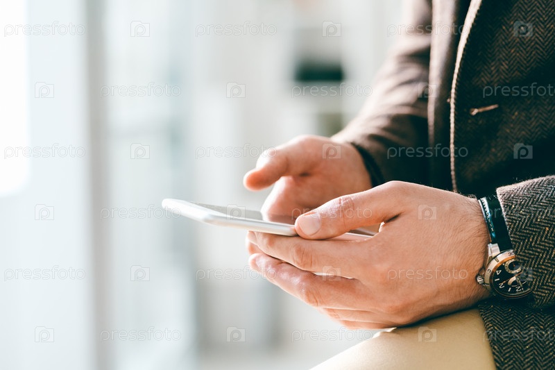 Молодой элегантный бизнесмен с наручными часами, держащий смартфон во время сообщения