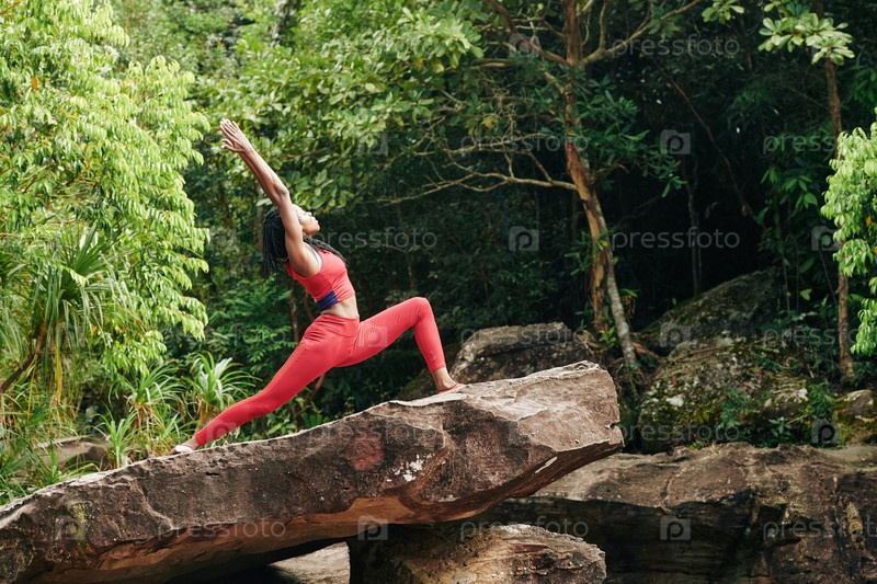 Женщина занимается йогой в тропическом лесу