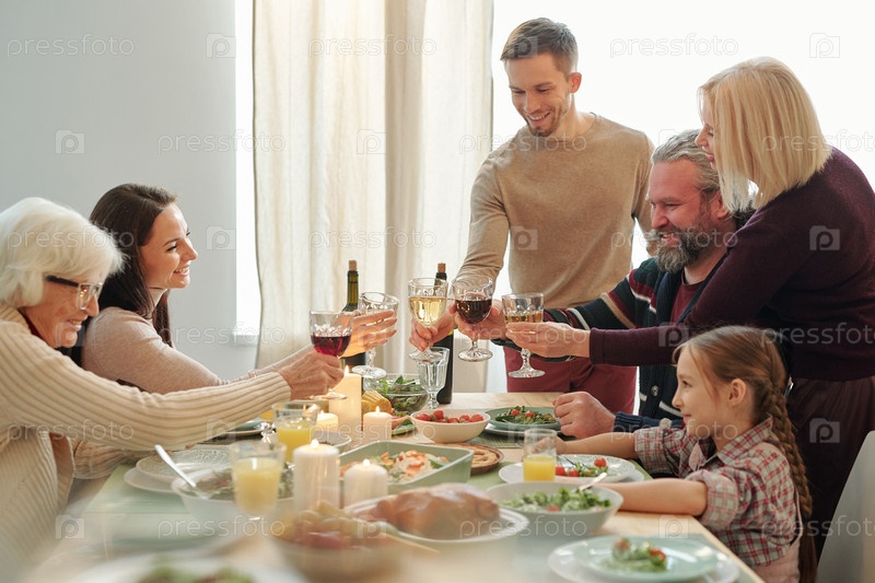 Счастливые, зрелые и молодые члены семьи скандируют вином во время рождественского тоста