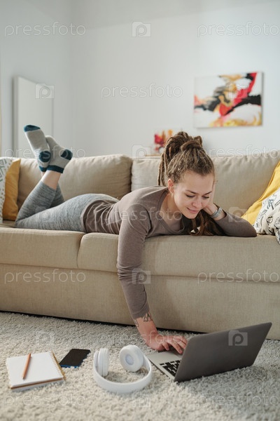 Счастливая девушка, лежащая на удобном диване и смотрящая видео на дисплее ноутбука