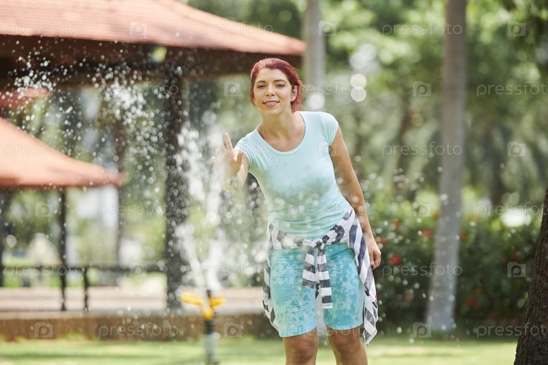 Веселая женщина в фонтане парка
