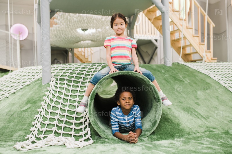 Маленькая азиатская девочка и ее друг африканской этнической принадлежности развлекаются на детской площадке