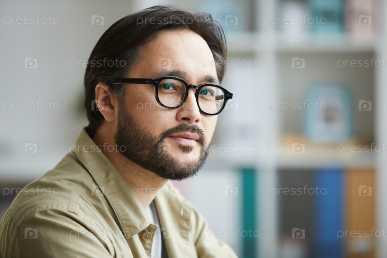 Портрет серьезного уверенного молодого азиатского мужчины с бородой и усами, носящего очки и рубашку во время работы в офисе