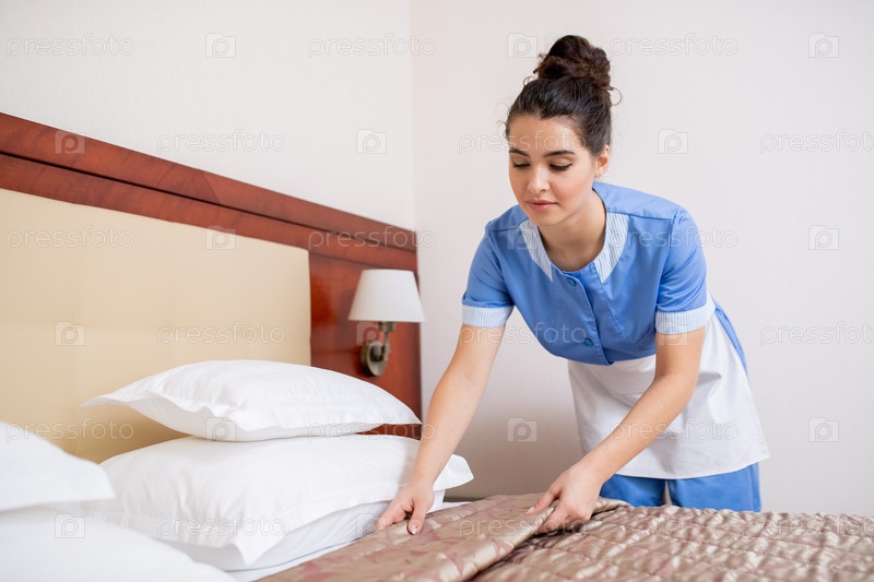 Красивая молодая брюнетка - горничная в синей форме, готовящая кровать в гостиничном номере