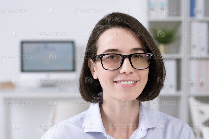 Довольно молодая улыбающаяся бизнес-леди в очках, которая смотрит на вас во время работы