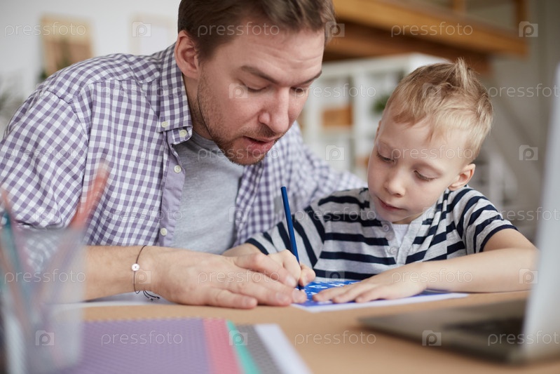 Концентрированный красивый молодой отец с нахмуренным лбом сидит за столом и учит писать письма штемпелем