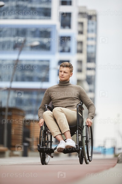Серьезный мыслящий молодой человек в обычном свитере переворачивает перила во время использования инвалидной коляски снаружи