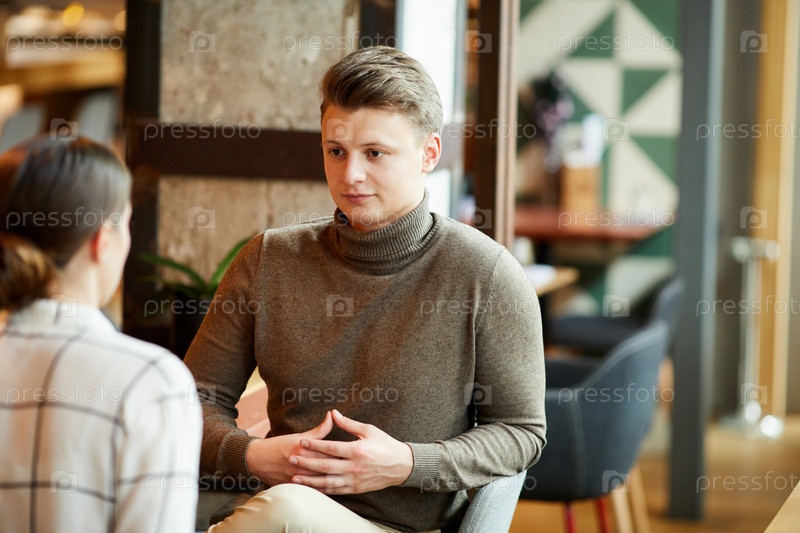 Серьезный молодой привлекательный менеджер в свитере, сидящий на стуле в уютном кафе и слушающий клиента на встрече