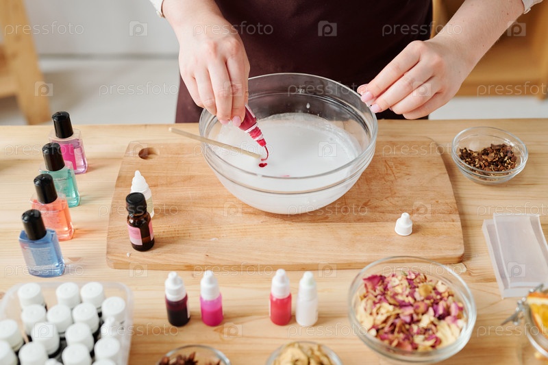 Руки девушки, помещающей цвет из маленькой пластиковой бутылки в жидкую массу мыла