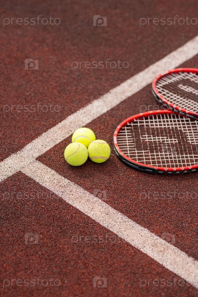 Две теннисные ракетки и три желтых мяча