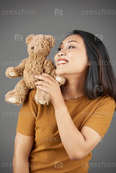 Веселая женщина с плюшевой игрушкой