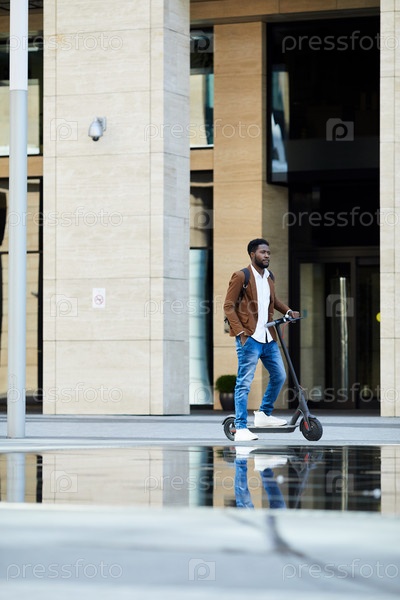 Красивый африканский мужчина едет на электрическом скутере