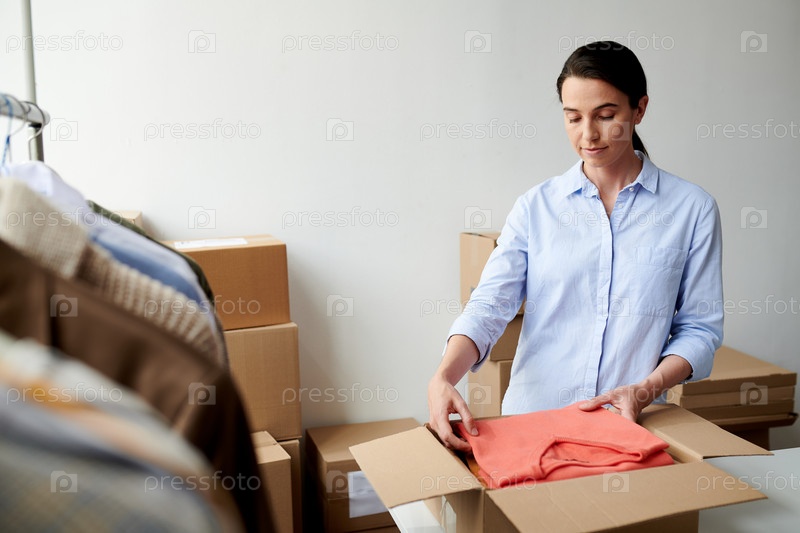 Молодой случайный сотрудник кладет сложенную повседневную одежду в коробку во время процесса упаковки