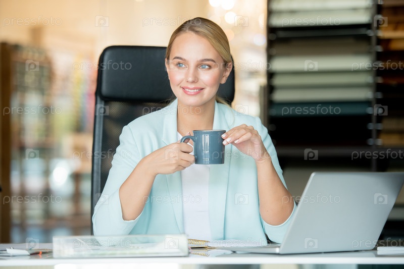 Молодая расслабленная бизнес-леди с напитком сидит у рабочего места