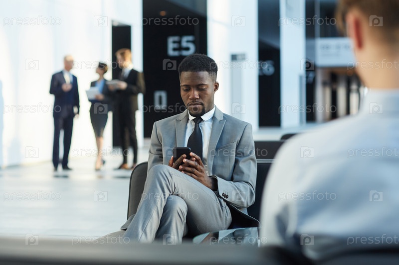Взрослый чернокожий бизнесмен, использующий телефон в коридоре