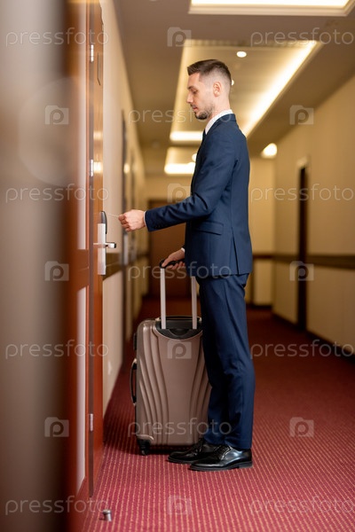 Молодой элегантный бизнесмен с чемоданом стоит перед закрытой дверью