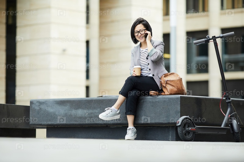 Улыбающаяся азиатская женщина говорит со смартфонами на открытом воздухе