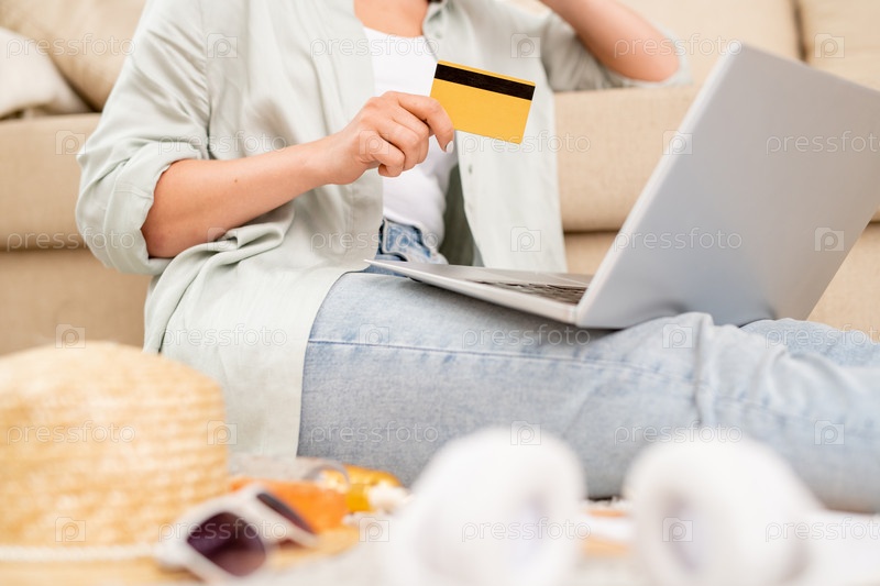 Молодая клиентка туристической компании с пластиковой картой, выбирающая онлайн-тур