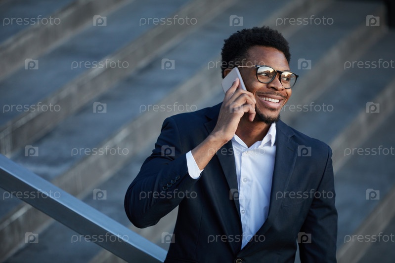 Улыбающийся успешный молодой афроамериканский адвокат в куртке стоит на лестнице снаружи и разговаривает по сотовому телефону