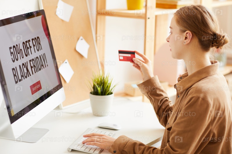 Молодая женщина с волосами, сидящая за столом и использующая кредитную карту при оплате онлайн через веб-сайт