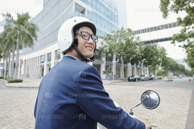 Счастливый бизнесмен, едущий на скутере