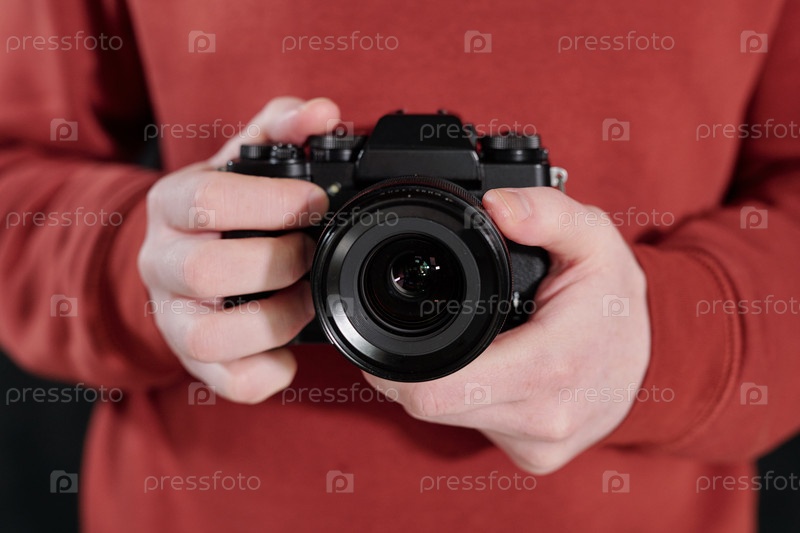 Руки молодого фотографа-мужчины в коричневой футболке, держащего новую камеру