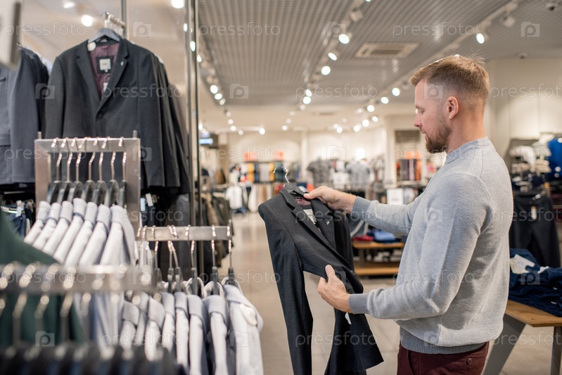 Парень в сером пуловере держит черную куртку, пока просматривает коллекцию