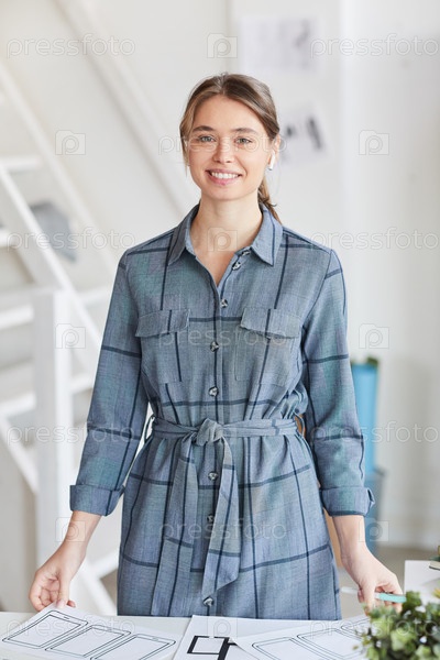 Портрет улыбающейся красивой молодой женщины в беспроводных наушниках, стоящей за столом с документами и работающей над дизайном ui