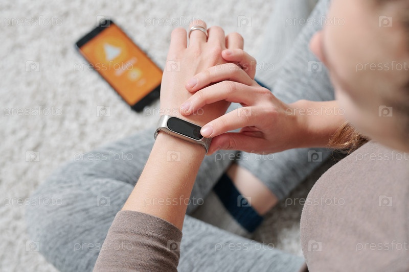 Руки молодой активной женщины со смарт-часами, сидящей на полу