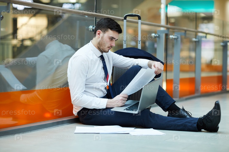 Серьезный концентрированный бородатый бизнесмен в формальной одежде сидит на полу в зоне ожидания аэропорта и работает с документами, используя ноутбук