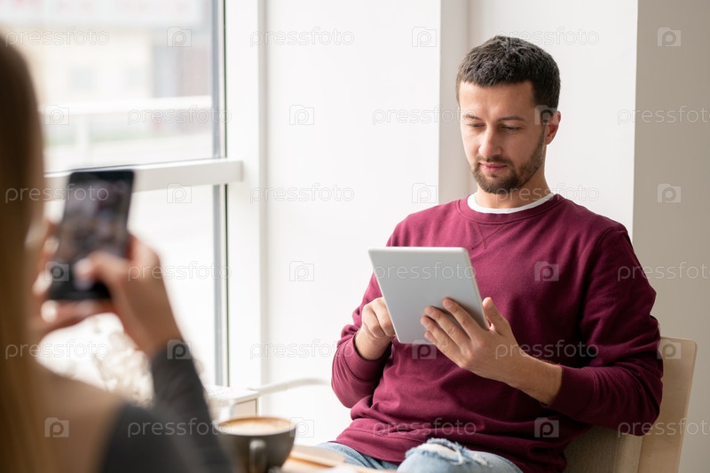 Случайный молодой человек с сенсорной панелью, расслабляющийся и смотрящий онлайн видео в кафе