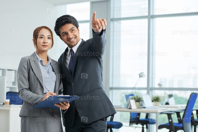 Деловая пара стоит в офисе