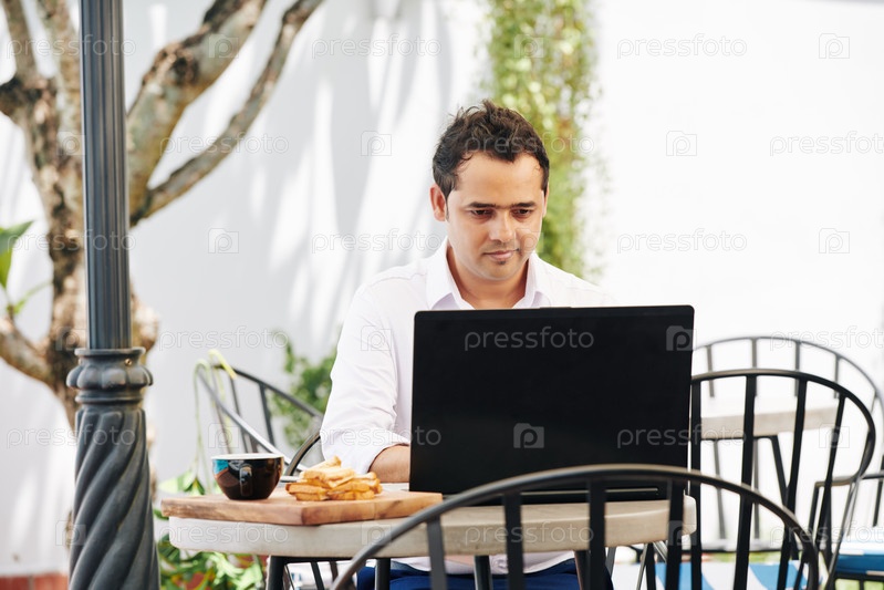 Индийский мужчина работает на ноутбуке в кафе