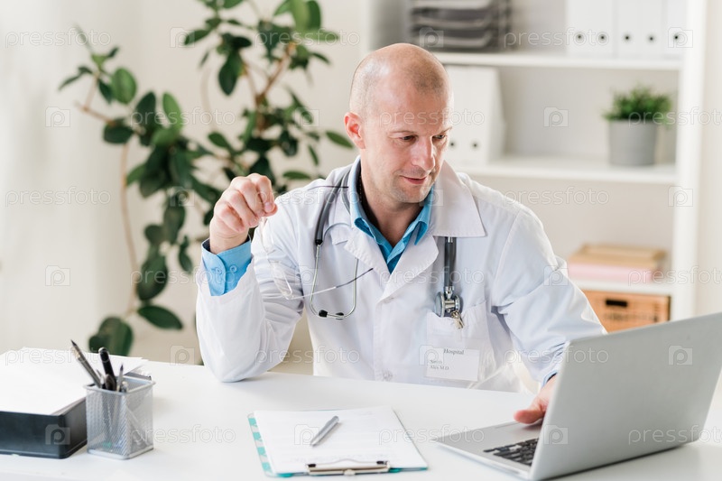 Лысый врач в униформе просматривает онлайн-информацию на ноутбуке
