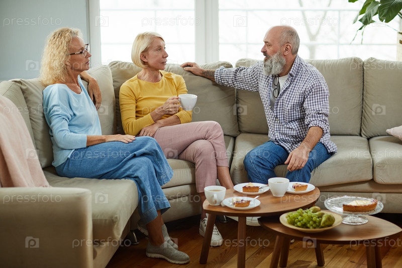 Зрелые друзья пьют чай дома