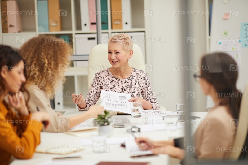Зрелая бизнесвумен разговаривает со своим персоналом