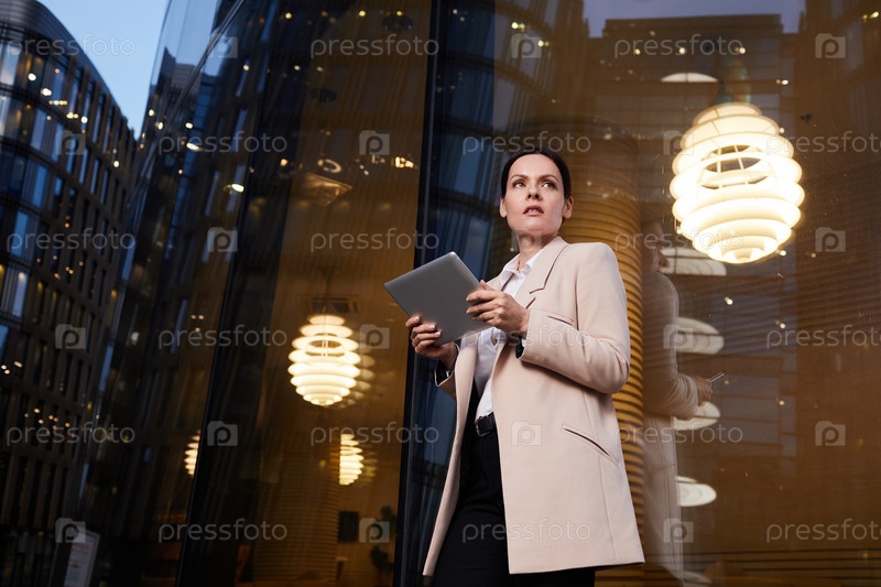 Современная деловая женщина среднего возраста в длинной куртке стоит у бизнес-центра с творческими люстрами и изучает данные на планшете