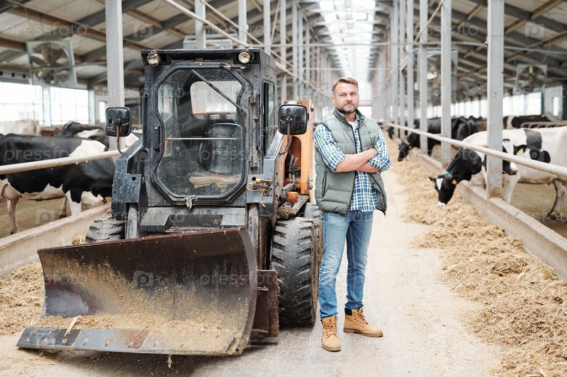 Успешный персонал фермы, стоящий на тракторе перед молочными коровами