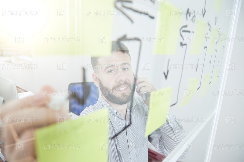 Бизнесмен пишет бизнес-стратегию на стене